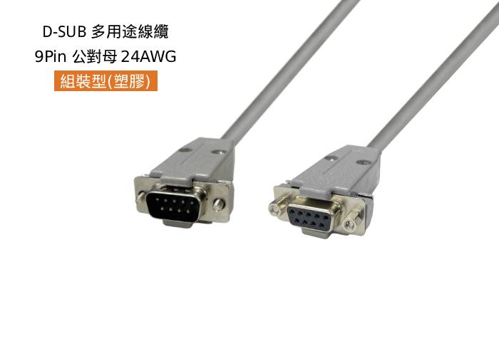D-SUB 多用途線纜, 組裝型-塑膠殼, 9 Pin,公 180°對母 180°,24AWG,#4-40,短固定螺絲, 灰色外被,4米