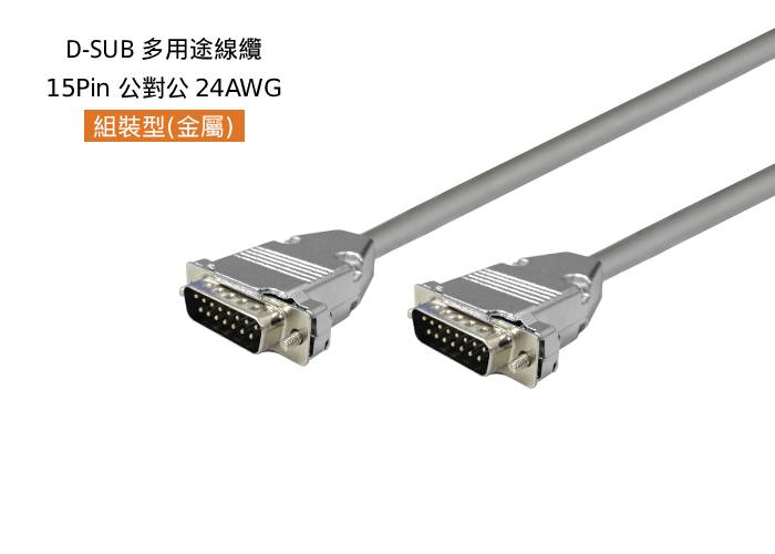 D-SUB 多用途線纜, 組裝型-金屬殼, 15 Pin,公 180°對公 180°,24AWG,#4-40,短固定螺絲, 灰色外被,4米
