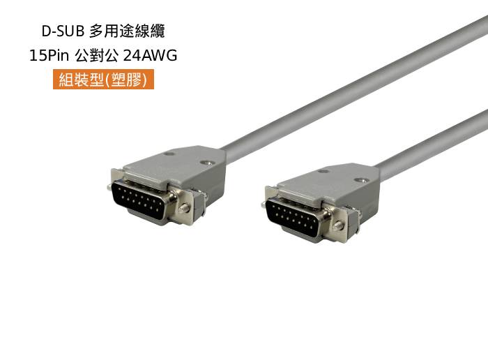 D-SUB 多用途線纜, 組裝型-塑膠殼, 15 Pin,公 180°對公 180°,24AWG,#4-40,短固定螺絲, 灰色外被,7米