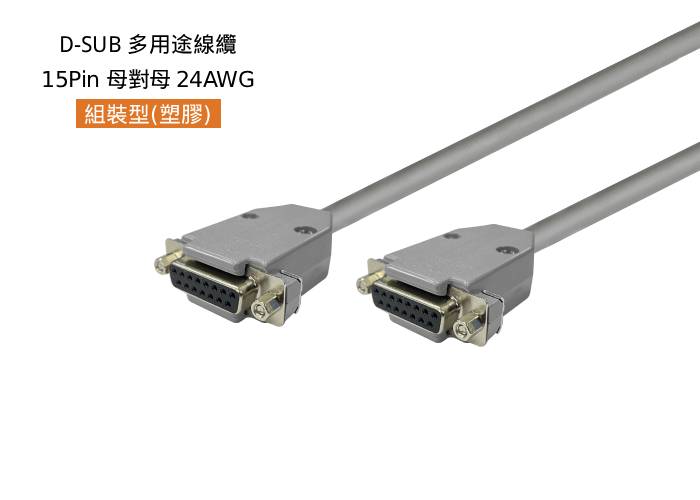 D-SUB 多用途線纜, 組裝型-塑膠殼, 15 Pin,母 180°對母 180°,24AWG,#4-40,短固定螺絲, 灰色外被,4米