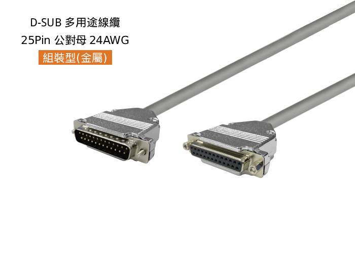 D-SUB 多用途線纜, 組裝型-金屬殼, 25 Pin,公 180°對母 180°,24AWG,#4-40,短固定螺絲, 灰色外被,4米