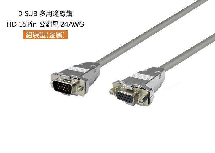 D-SUB 多用途線纜, 組裝型-金屬殼,HD 15 Pin,公 180°對母 180°,24AWG,#4-40,短固定螺絲, 灰色外被,4米