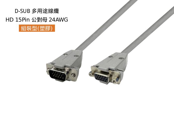 D-SUB 多用途線纜, 組裝型-塑膠殼,HD 15 Pin,公 180°對母 180°,24AWG,#4-40,短固定螺絲, 灰色外被,4米