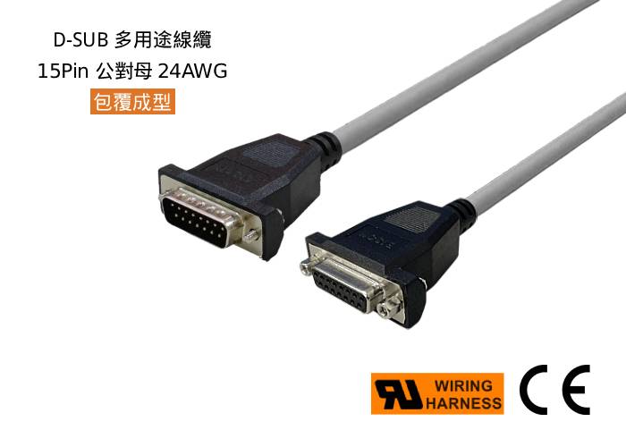 D-SUB 多用途線纜,包覆成型,15 Pin,公 180°對母 180°,24AWG,#4-40,短固定螺絲, 灰色外被,1米