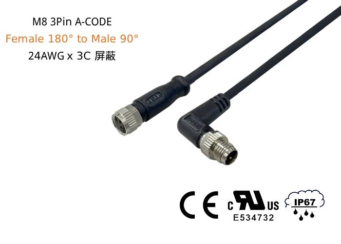 傳感/致動器線組M8 3-PIN A-CODE, 母180°對公90°, 24AWG(0.25 mm²)x3C, SHIELDED, TPU/PUR JACKET,黑色,1米
