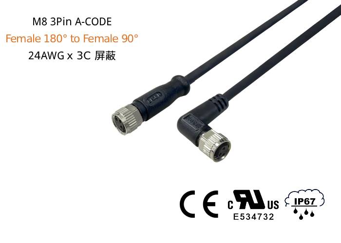 傳感/致動器線組M8 3-PIN A-CODE, 母180°對母90°, 24AWG(0.25 mm²)x3C, SHIELDED, TPU/PUR JACKET,黑色,1米