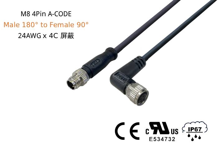 傳感/致動器線組M8 4-PIN A-CODE, 公180°對母90°, 24AWG(0.25 mm²)x4C, SHIELDED, TPU/PUR JACKET,黑色,10米