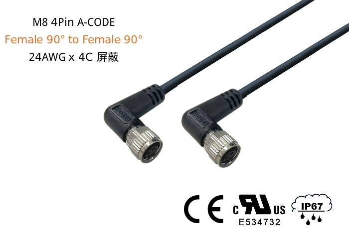 傳感/致動器線組M8 4-PIN A-CODE, 母90°對母90°, 24AWG(0.25 mm²)x4C, SHIELDED, TPU/PUR JACKET,黑色,1米