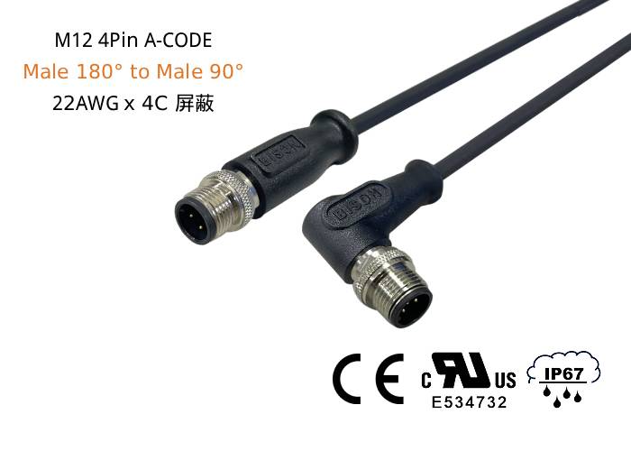 傳感致動器線組M12 4PIN A-CODE, 公180°對公90°, 22AWG(0.34 mm²)x4C, SHIELDED, TPU/PUR JACKET,黑色,10米